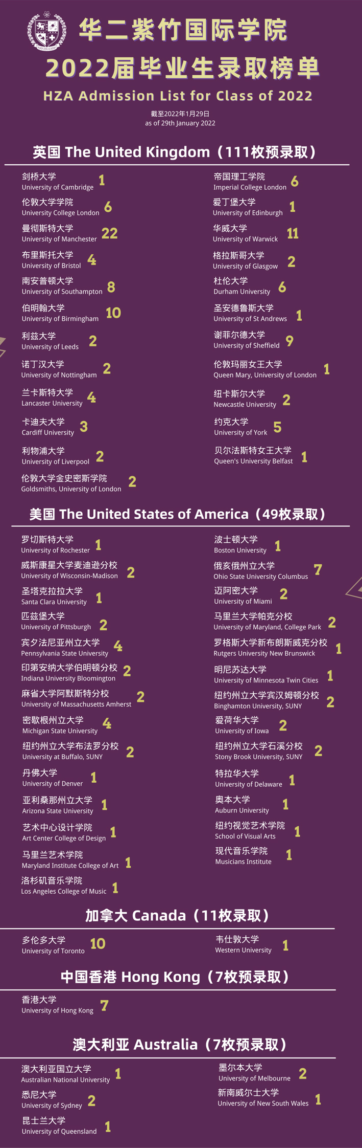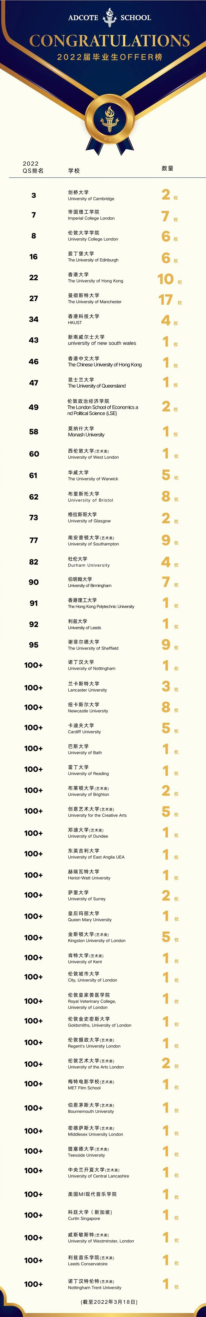 阿德科特,截至3月18日,2022届57位毕业生共收到来自英国、美国、澳大利亚、新加坡和中国香港地区的共159份预录取通知。QS世界大学排名Top50数量为57枚、Top100数量为105枚,其中包含剑桥大学2枚、伦敦政治经济学院(LSE)2枚、帝国理工大学7枚、伦敦大学学院(UCL)6枚、香港大学10枚、曼彻斯特大学17枚、华威大学5枚、布里斯托大学8枚、伦敦艺术大学2枚……