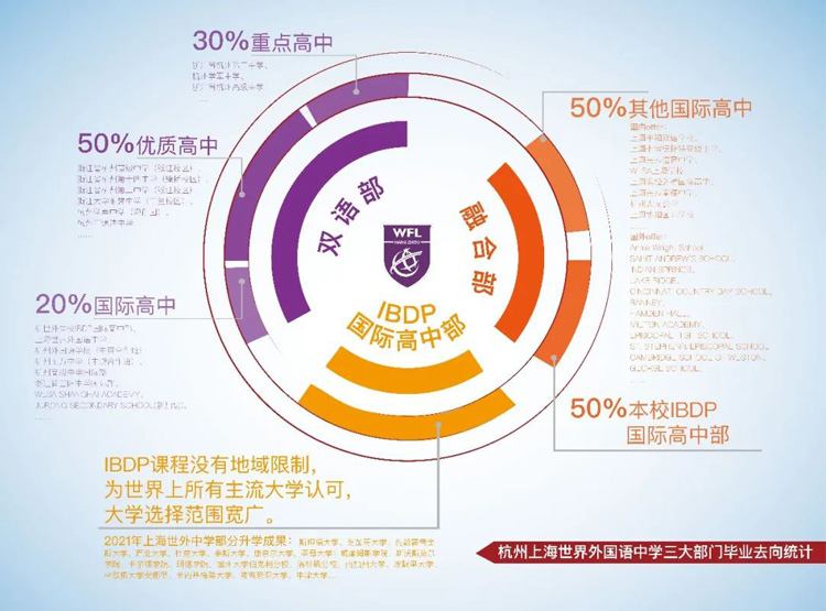 杭州上海世界外国语中学(简称杭州世外)是世外教育集团继上海世界外国语中学后,在中国开办的第二所IB全系列世外教育集团学校,学校下设双语部初中、融合部初中及IBDP国际高中三大板块。学校以培养“走向世界的现代中国人”为目标,积极探索实践素质教育,培养具有“爱心、优雅、大气”品质的学生,以“积极参与、努力实践”(简称”P&P”)为核心教育理念,并逐步发展至“在参与中学会合作,在实践中学会创新”(简称”C&C”),始终强调发挥学生的主体作用,挖掘学生的潜能,培养学生的合作精神,提高学生的创新能力。