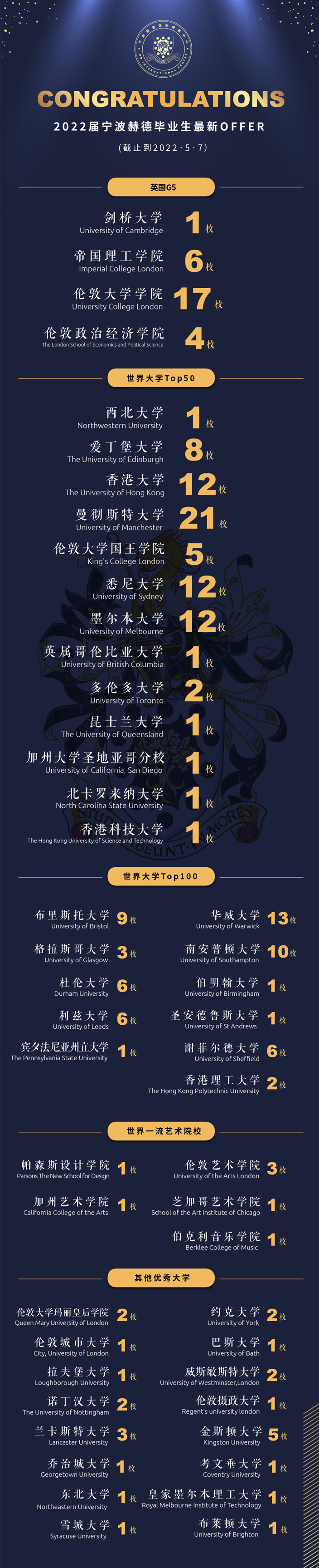 截止5月9日,2022届准毕业生共收获海外大学预录取通知书 201枚,其中74%的毕业生获得世界TOP50院校的offer。