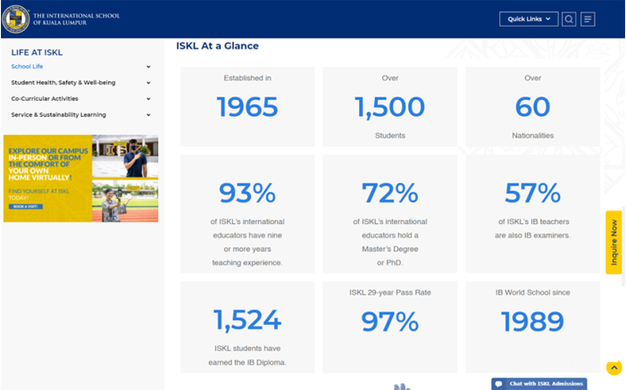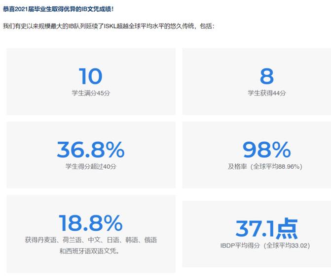 吉隆坡国际学校(ISKL)持国际文凭(IB)文凭学生的得分再次超过了世界的平均水平。2021年吉隆坡国际学校(ISKL)持国际文凭(IB)文凭学生的IB平均分是37.1分,世界平均水平为33.02分,其中10人获得满分45分,8人获得44分。ISKL合格率为98%,全球为88.96%。在马来西亚国际学校IB文凭学生中考试成绩超过40分,占IB考生的36.8%。