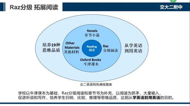 学校以牛津课本为基础,Raz分级阅读和章节书为补充,以阅读为抓手,大量输入,促进听说和写作,培养学生归纳、比较、推理等思维品质,达到从学英语到用英语的目的。