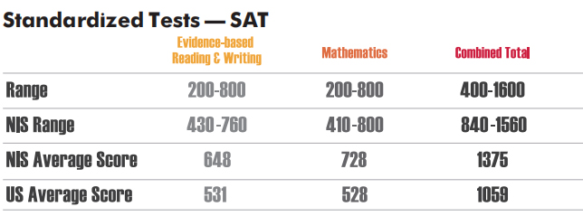 2020年,NIS的IB文凭成绩及SAT考试成绩均高出世界平均水平。