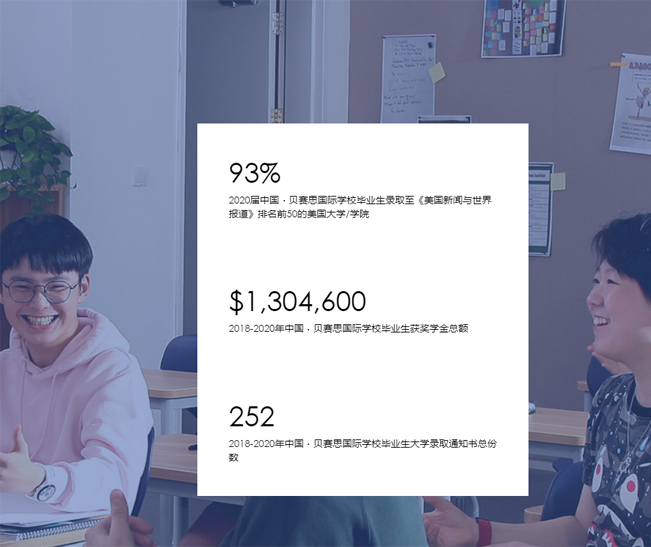 据统计,93%的2020届中国贝赛思国际学校毕业生录取至《美国新闻与世界报道》排名前50的美国大学。