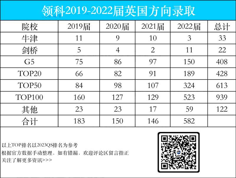领科近4年牛剑总offer数为55封,G5总数为408封。