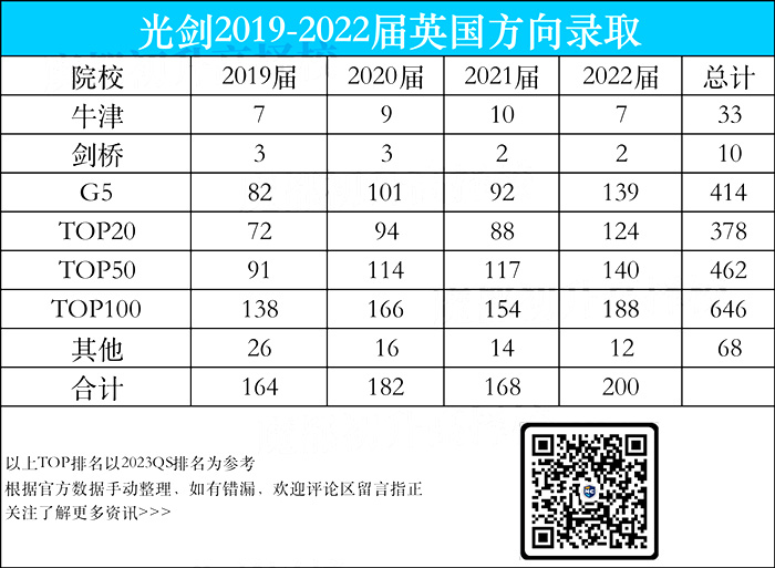 光剑近4年牛剑总offer数为43封,G5总数为414封。