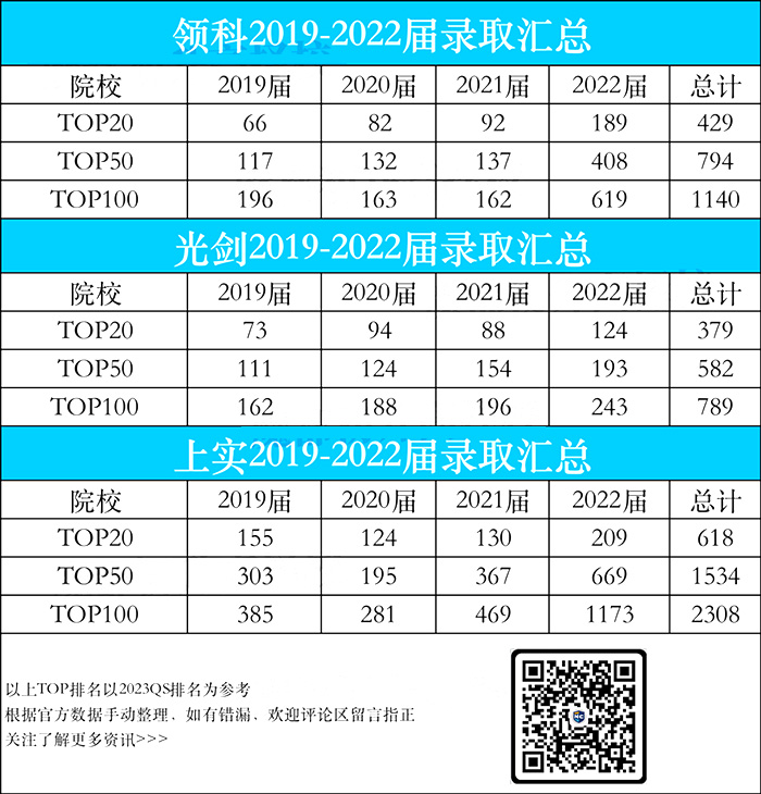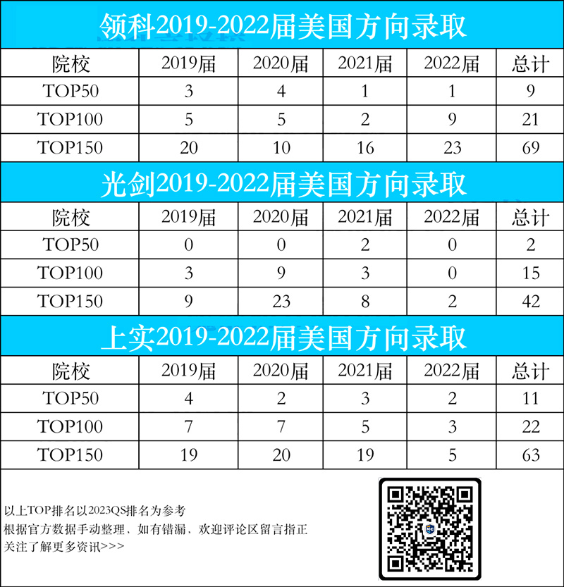 当然学校的人数,主申目标不同,最后的申请结果自然有差异,如果想进一步分析各学校升学表现,可以码住我们的完整数据~