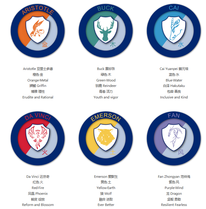 七宝德怀特设有六个学院,分别为Aristotle亚里士多德;Buck赛珍珠;Cai Yuanpei蔡元培;Da Vinci达芬奇;Emerson 艾默生;Fan Zhongyan范仲淹。