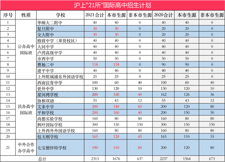公办高中国际班10所,包括华二附中、复旦附中、交大附中在内,2021年共招收上海生源453人,2020年招收405人,扩招48人,不招收非上海生源。