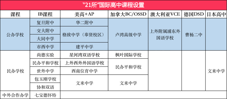 上外附属浦东外国语学校开设了澳大利亚课程,曹杨二中开设了德国DSD课程,文来中学开设了日本高中课程。