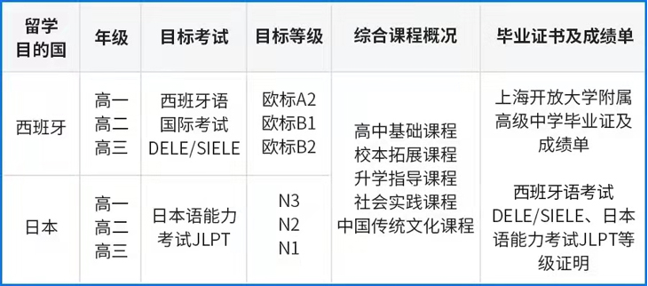 以高中课程为基石,“一带一路”沿线国家语种教学(西班牙语、日语等)为特色,为学生境内外多途径升学打好高中学历及语言基础。
