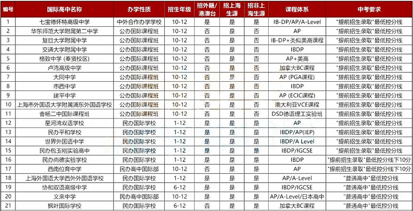“民办国际学校”和“中外合作办学学校”这两类共计11所学校中,5所必须达到中考"提前招生录取"最低控分线(640);2所必须达到"提前招生录取"最低控分线下10分(630);4所须达到“普通高中"最低控分线(540)。