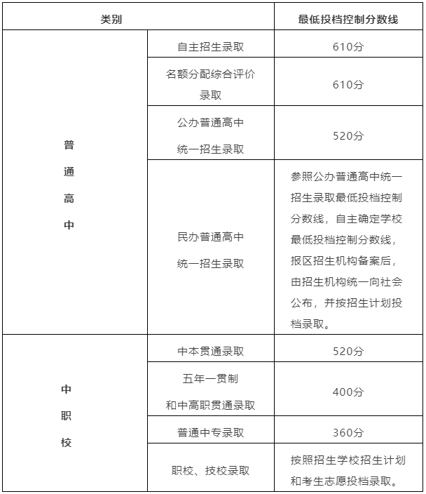 2022年上海市高中阶段学校各类别招生最低投档控制分数线如下:
