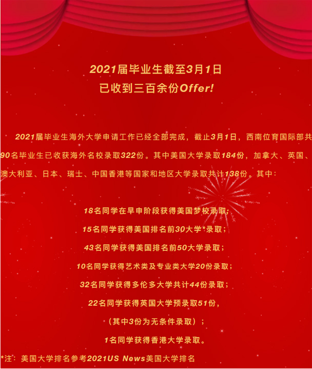 2021届毕业生录取实现新的突破,100位毕业班学子共收到442封海外名校录取,其中41封录取通知书来自于世界排名前三十的院校,82封来自于世界排名前五十的院校!奖学金累计约合人民币850万元!