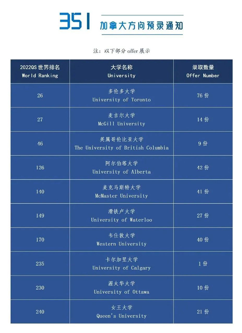 加拿大方向:23枚多伦多大学、2枚英属哥伦比亚大学。