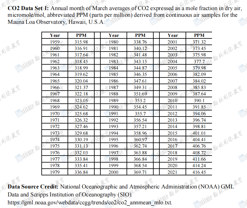 ① 你同意二氧化碳浓度水平的说法吗?使用CO2数据集1来分析CO2变化