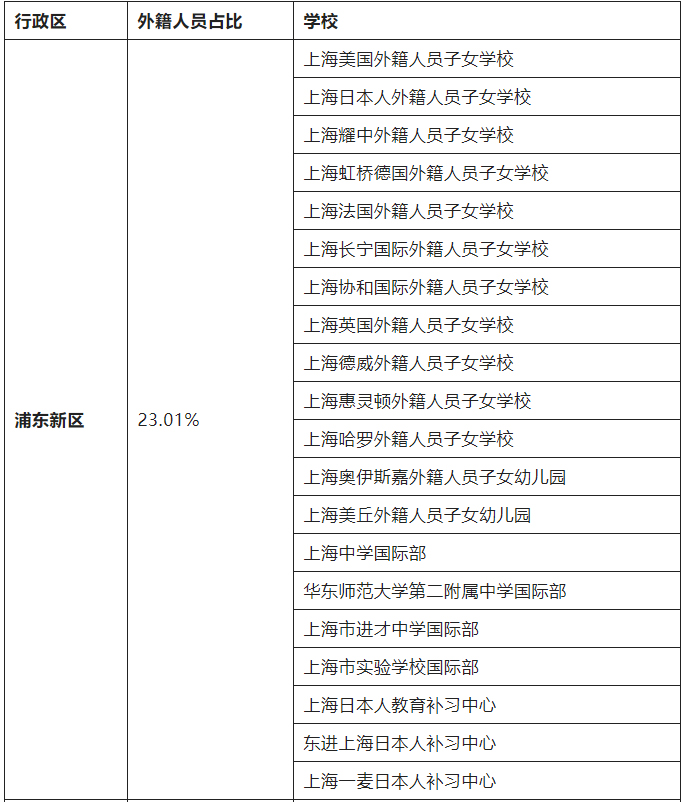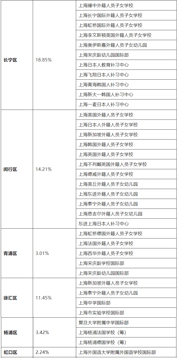 上海市徐汇区及其他各区外籍人员与外籍人员子女学校的分布情况表
