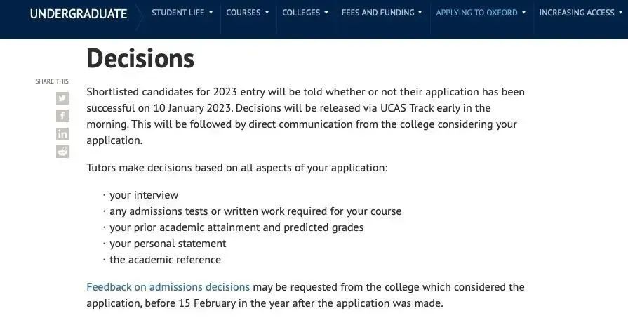 牛津大学G5中最直接的,2023年1月10日会放榜,录取结果于英国时间清晨通过UCAS Track发布。