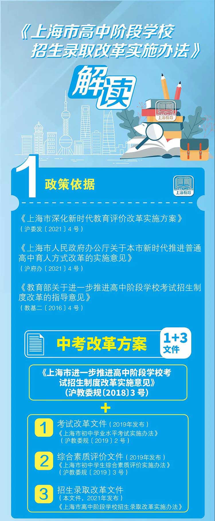 3月16日,上海市教委公布了《上海市高中阶段学校招生录取改革实施办法》(以下简称《实施办法》)。《实施办法》是2018年《上海市进一步推进高中阶段学校考试招生制度改革的实施意见》(以下简称《中考改革方案》)的配套文件,适用于2022年起参加本市高中阶段学校招生录取的考生。文件坚持立德树人、科学有效、统筹兼顾的原则,旨在充分发挥招生录取改革的正面导向作用,进一步促进学生全面发展、义务教育阶段学校优质均衡和高中阶段学校特色多样发展。按照三年早知道原则,《实施办法》的核心精神已在《中考改革方案》中明确。