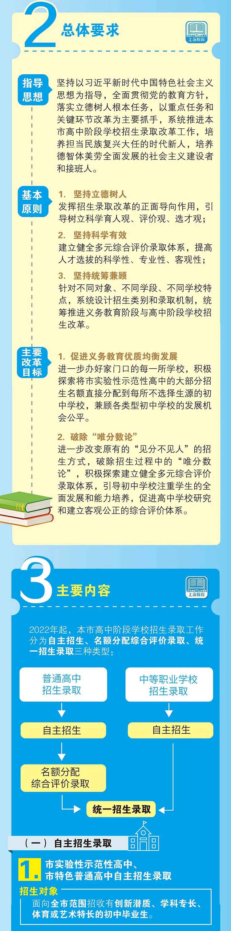 从2022年起,本市高中阶段学校招生录取工作分为自主招生录取、名额分配综合评价录取和统一招生录取三种类型。最新公布的《实施办法》进一步细化了自主招生比例、名额分配方式、综合评价录取程序等内容。