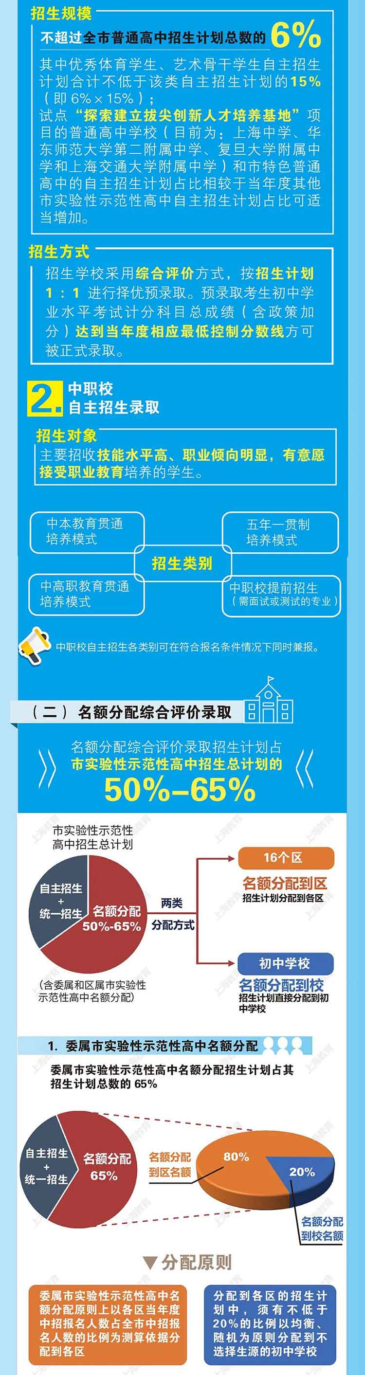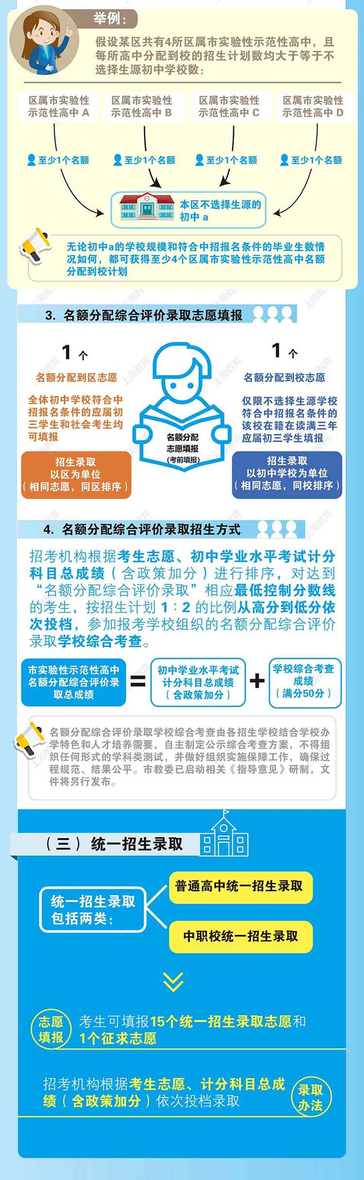 名额分配综合评价录取是上海《中考改革方案》确定的招生录取新办法。具体包括名额分配到区招生录取和名额分配到校招生录取两类,合计占市实验性示范性高中招生总计划的50%-65%,与改革前相比,名额分配比例进一步扩大。其中,名额分配到区招生录取,以区为单位,依据总分排序按计划录取;名额分配到校招生录取,以初中学校为单位,依据总分排序按计划录取。