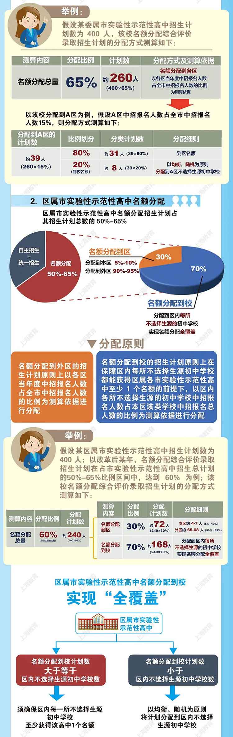 《实施办法》特别明确了名额分配的具体要求:一是委属市实验性示范性高中名额分配招生计划占其招生计划总数的65%,原则上以各区当年度中招报名人数占全市中招报名人数的比例为测算依据分配到各区,分配到各区的计划中须有不低于20%的比例以均衡、随机为原则分配到不选择生源的初中学校。二是区属市实验性示范性高中的名额分配招生计划占其招生计划总数的50-65%,其中,分配到区招生计划约占本校名额分配招生计划的30%,分配到校招生计划约占本校名额分配招生计划的70%。各区属市实验性示范性高中的名额分配到校招生计划,原则上以所属区内各所不选择生源初中学校中招报名人数占本区该类学校中招报名总人数的比例为测算依据,分配到本区每所不选择生源的初中学校,实现名额分配全覆盖。文件指出,市实验性示范性高中的分校或校区,原则上按照区属市实验性示范性高中招生录取政策执行。