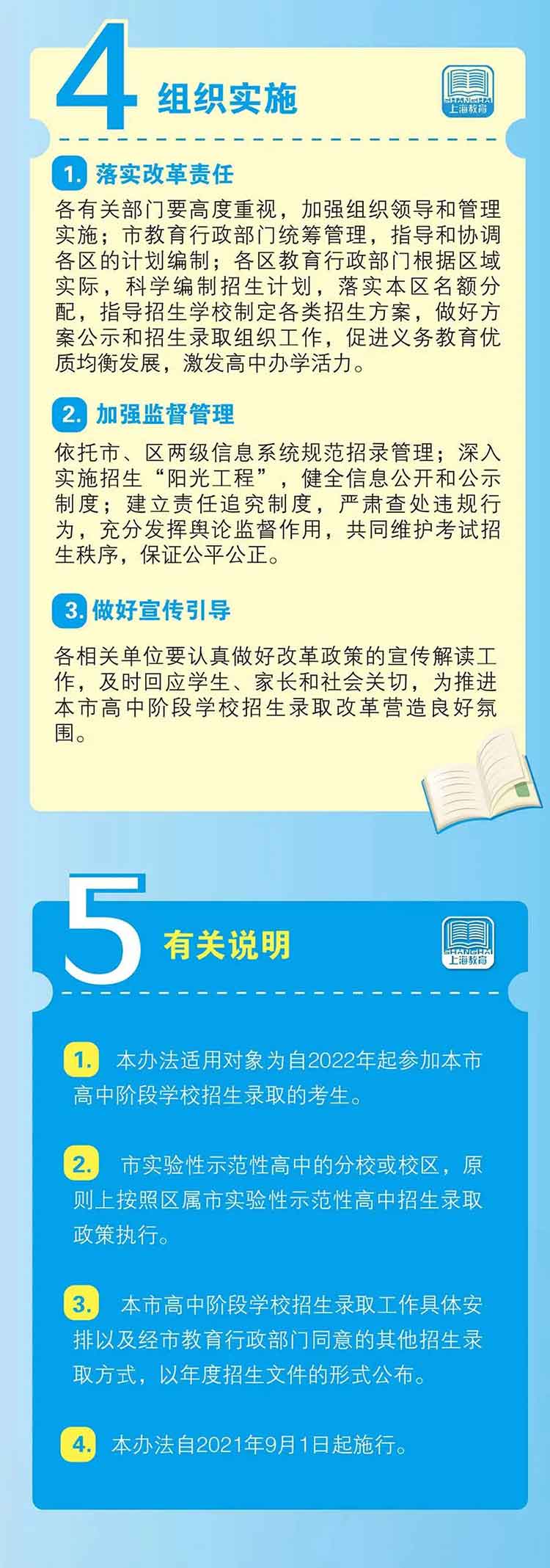 《实施办法》指出,各区教育行政部门要结合示范性学区或集团创建、初中强校工程、新优质学校建设等工作,制定本区招生录取工作方案,科学编制本区招生计划,落实本区名额分配工作;指导区内的相关高中制定自主招生及学校综合考查方案,并做好相关方案的公示工作。同时,要建立责任追究制度,严肃查处综合素质评价、考试招生中存在的违规行为。