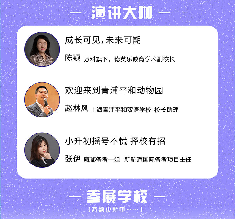 讲座简介:陈颖 万科旗下,德英乐教育学术副校长 赵林风 上海青浦平和双语学校-校长助理 张伊 魔都备考-姐新航道国际备考项目主任