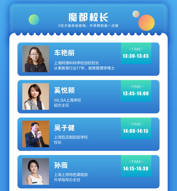 讲座简介:车艳丽 上海阿德科特学校创校校长 从事教育行业17年,教育管理学博士 奚悦颖 WL SA上海学校 招办主任 吴子健 上海包玉刚实验学校 校长 孙薇 上海上师特色课程部 升学指导办主任