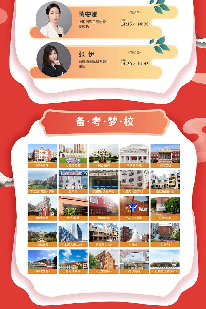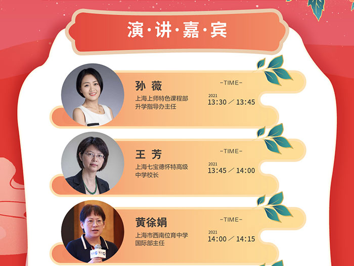 讲座简介:孙薇:上海上师特色课程部 升学指导办主任 慎安娜:上海诺思兰顿学校 副校长 王芳:上海七宝德怀特高级 中学校长 张伊:新航道国际备考项目 主任