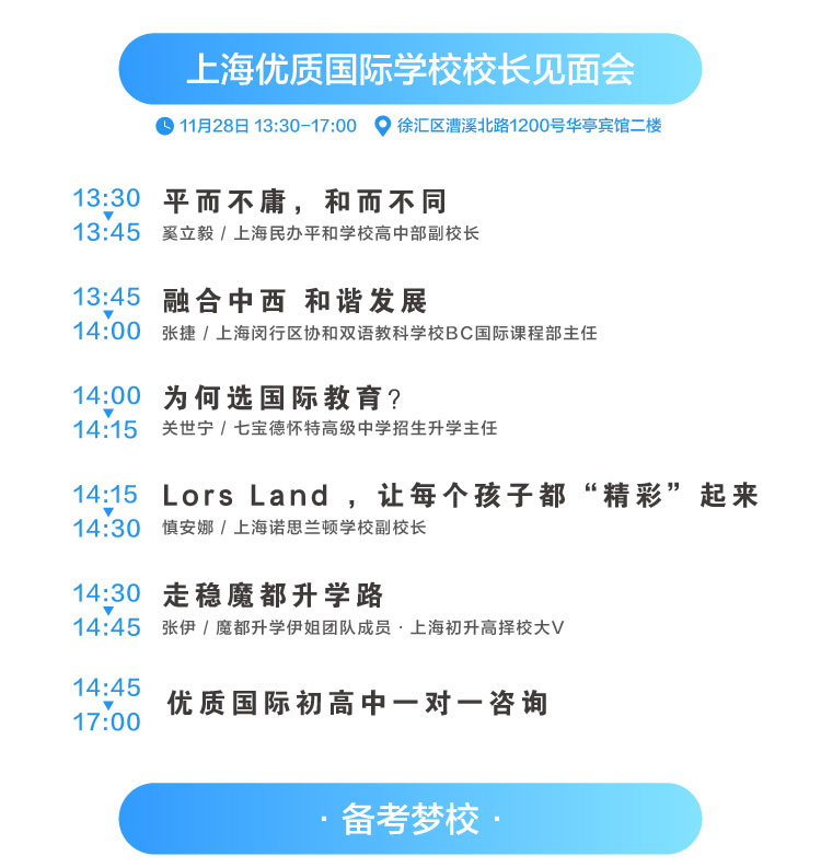 讲座简介:奚立毅/上海民办平和学校高中部副校长 张捷/ 关世宁/七宝德怀特高级中学招生升学主任 上海闵行区协和双语教科学校BC国际课程部主任 慎安娜/上海诺思兰顿学校副校长