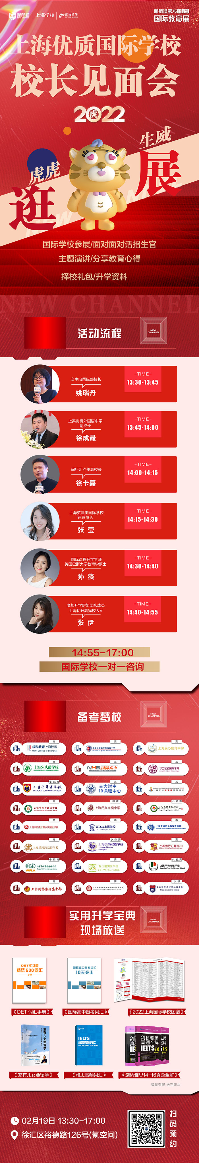 讲座简介:姚瑞丹 交中IB国际部校长 13:30-13:45 徐成最 上实剑桥外国语中学 副校长 13:45-14:00 徐卡嘉 闵行汇点美高校长 14:00-14:15 张莹 上海英浪美国际学校 运营校长 14:15-14:30 孙薇 英国巴斯大学教育学硕士 国际课程升学导师 14:30-14:40 张伊 魔都升学伊姐团队成员 上海初升高择校大V 14:40-14:55 国际学校一对一咨询 14:55-17:00