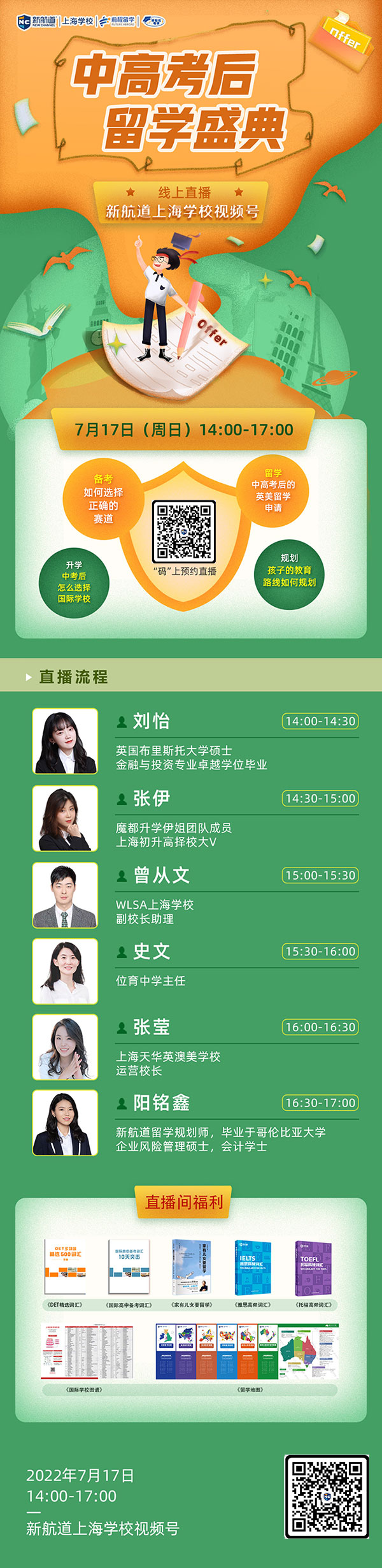 讲座简介:刘怡 英国布里斯托大学硕士 金融与投资专业卓越学位毕业 张伊 魔都升学伊姐团队成员 上海初升高择校大V 曾从文 WLSA.上海学校 副校长助理 史文 位育中学主任 张莹 上海天华英澳美学校 运营校长 阳铭鑫 新航道留学规划师,毕业于哥伦比亚大学 企业风险管理硕士,会计学士