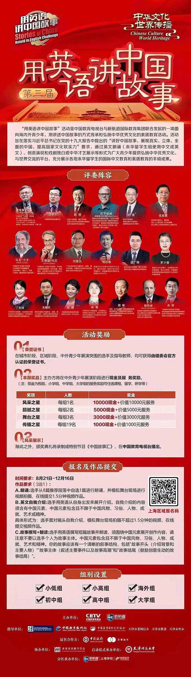 “用英语讲中国故事”活动是中国教育电视台与新航道国际教育集团联合发起的一项面向海内外青少年,用讲述中国故事的方式传承和弘扬中华优秀文化的素质教育活动。