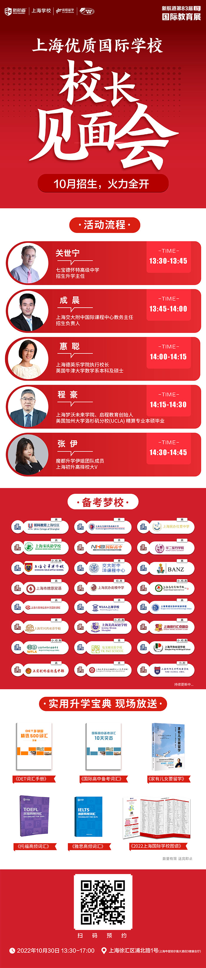 讲座简介:关世宁 13:30-13:45 七宝德怀特高级中学 招生升学主任 成晨 13:45-14:00 上海交大附中国际课程中心教务主任 招生负责人 惠聪 14:00-14:15 上海德英乐学院执行校长 英国牛津大学数学系本科及硕土 程豪 14:15-14:30 上海梦沃未来学院、启程教育创始人 美国加州大学洛杉矶分校(UCLA)精算专业本硕毕业 张伊 14:30-14:45 魔都升学伊姐团队成员-上海初升