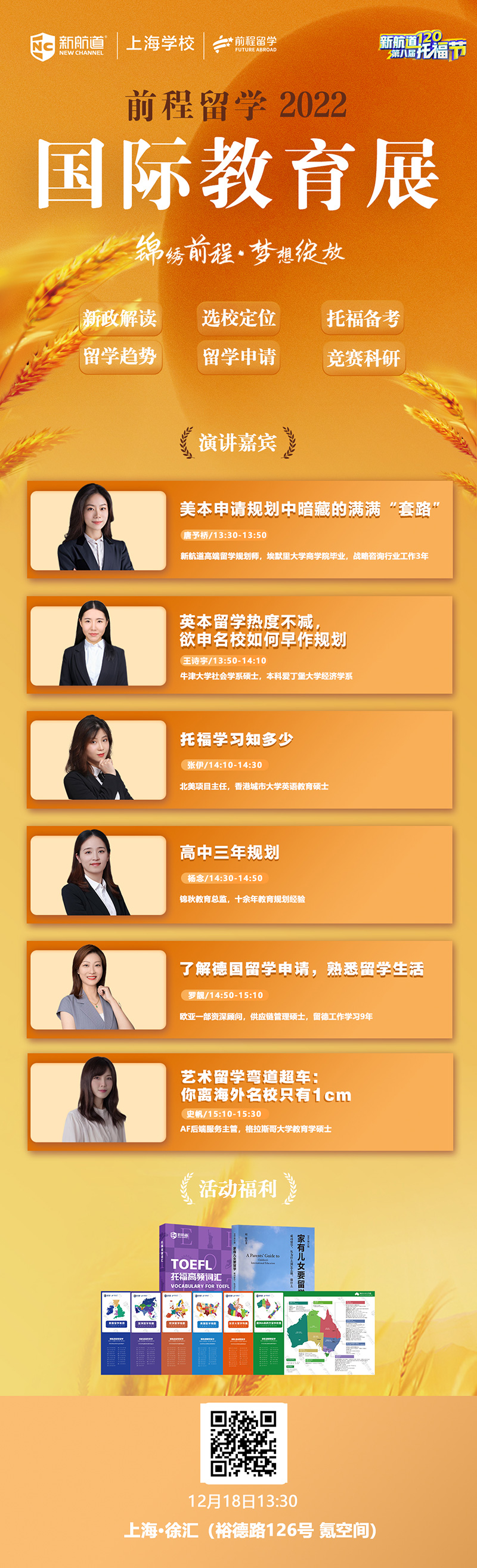 讲座简介:王诗宇/13:50-14:10 牛津大学社会学系硕土,张伊/14:10-14:30 北美项目主任,香港城市大学英语教育硕土本科爱丁堡大学经济学系 杨念/14:30-14:50 锦秋教育总监,十余年教育规划经验罗规/14:50-15:10 欧亚一部资深顾问,供应链管理硕土,留德工作学习9年史帆/15:10-15:30 AF后端服务主管,格拉斯哥大学教育学硕士