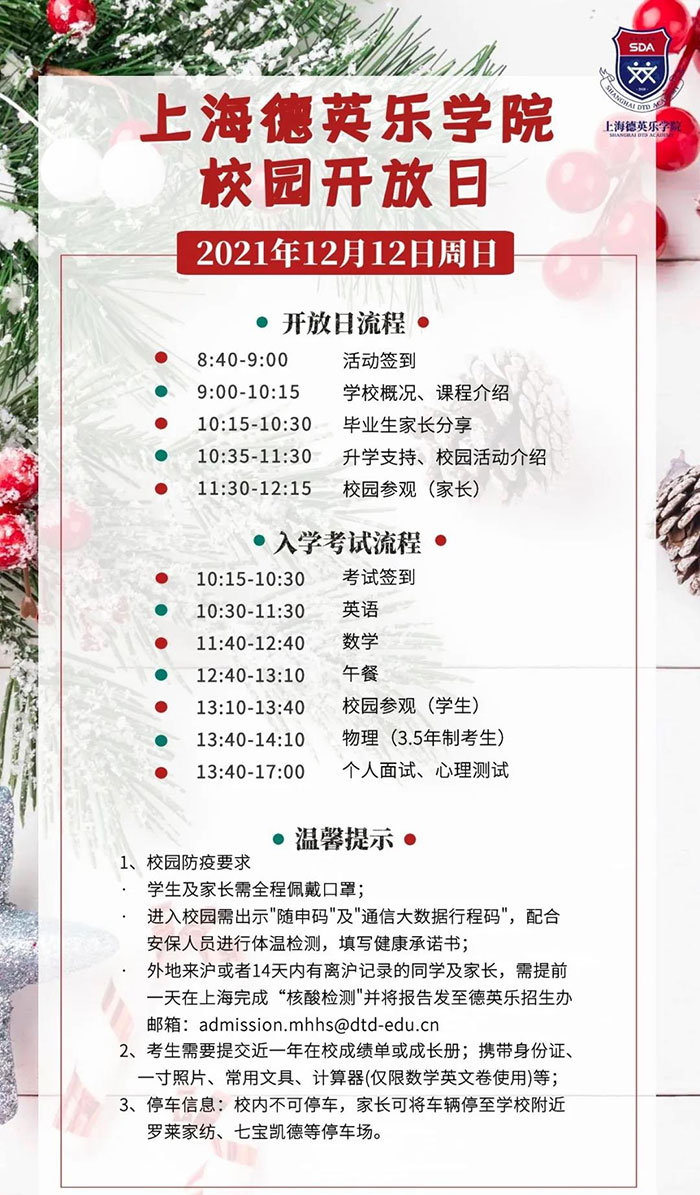 2021年12月12日周日即将在上海德英乐学院举办校园开放日及入学考试,届时您将全面了解学校,包括:教育理念、课程设置、全球升学、学生发展与活动、招生信息等,零距离对话招生官,感受校园文化氛围。开放日预约请联系我校招生办:021-34750061/34750062