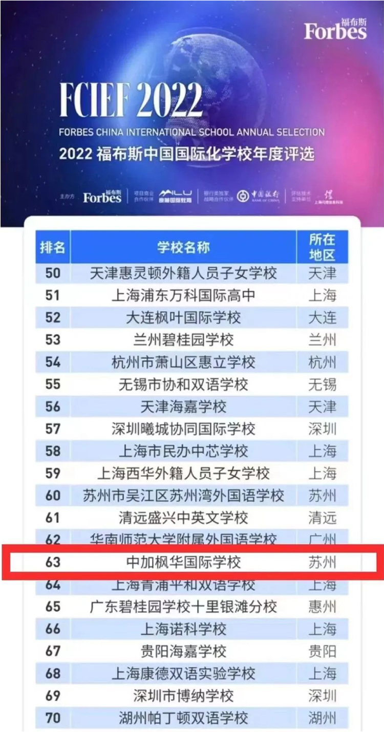 5月24日,福布斯中国正式发布2022福布斯中国•国际化学校年度评选结果。中加枫华国际学校以多年的教育积累与本土影响力,荣登全国百强,位列全国第63位,江苏地区第8位。
