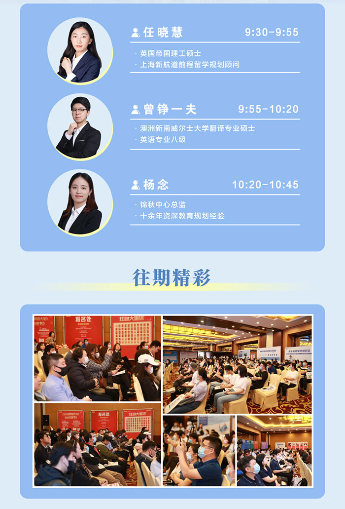 讲座简介:任晓慧 ·英国帝国理工硕士 ·上海新航道前程留学规划顾问 曾铮一夫 ·澳洲新南威尔士大学翻译专业硕士 ·英语专业八级 杨念 10:20-10:45 ·锦秋中心总监 ·十余年资深教育规划经验