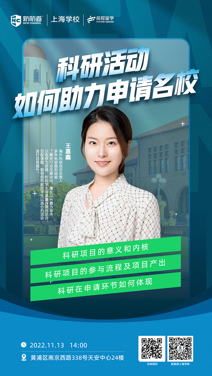 讲座简介:王嘉鑫:海外科研项目负责人 多年科研规划经验 了解多行业发展动向擅长以兴趣为导向 以收获为前提,针对学生背景筛选项目 匹配课题,指导各年龄段学生以适合的活动进行自我提升