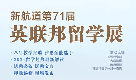 新航道长宁校区长宁路1158号贝多芬广场4楼414室 2021年10月23日(周六)14:00主题:10月24日新航道17周年庆典暨 英联邦留学展
