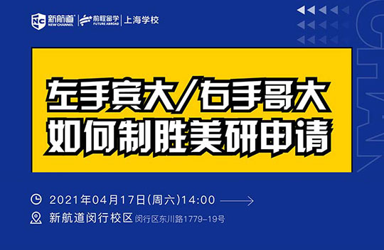 新航道徐汇校区(裕德路126号) 2021年05月09日(周日)主题:左手宾大/右手哥大 如何制胜美研申请