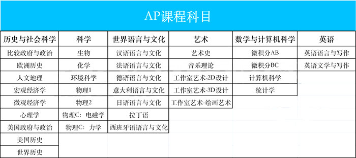 我们可以简单把AP课程为6个大类。分别是历史与社会科学、科学、艺术、数学与计算机科学、世界语言和文化、英语。学生可以从这些门类中选择学习3-4门。可以根据自己的兴趣爱好和未来的申请方向,来选择适合的课程来学习。
