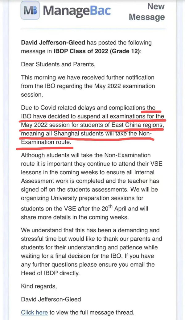 今日上午我们收到了IBO关于2022年5月考试的通知,鉴于目前疫情影响,决定暂停2022年5月华东地区学生的所有考试,这意味着所有上海学生将采取非考试途径获得成绩。