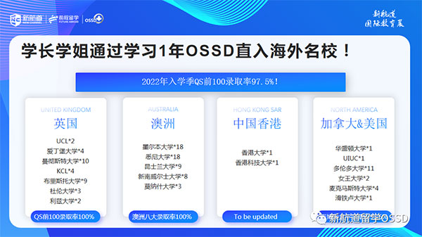 2022年入学季新航道OSSD学生,QS前100院校录取率97.5%。
