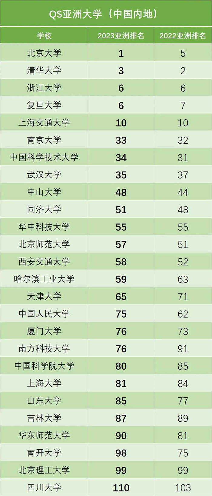 QS高级副总裁Ben Sowter表示:“在2023QS亚洲地区大学排名中,中国大陆高校取得了历史最好成绩,这表明中国在亚洲高等教育领域最前沿发挥了极大的潜力。