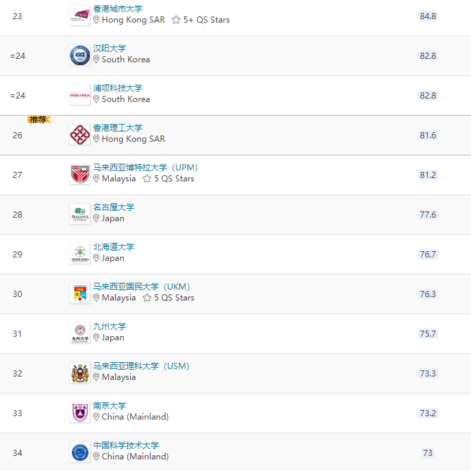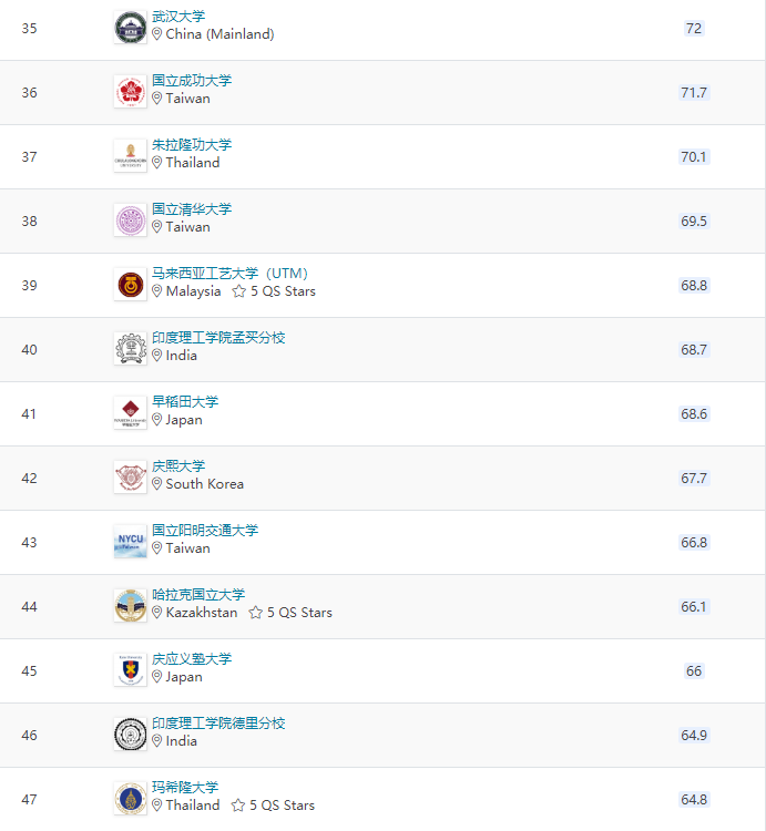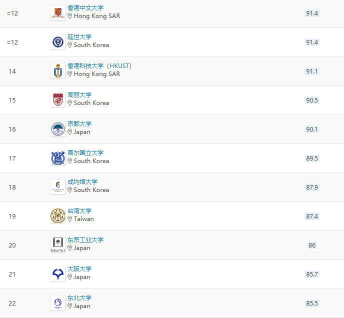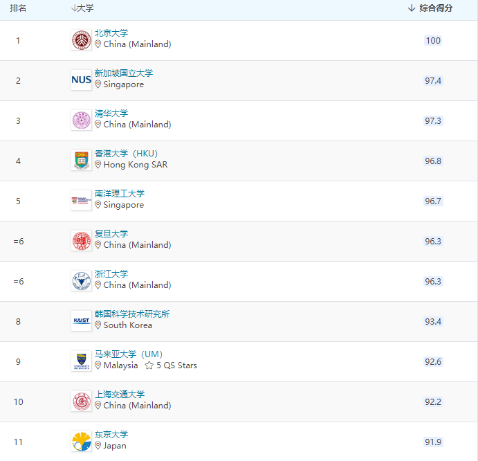 国际高等教育研究机构QS Quacquarelli Symonds发布了第十五版亚洲地区大学排名。