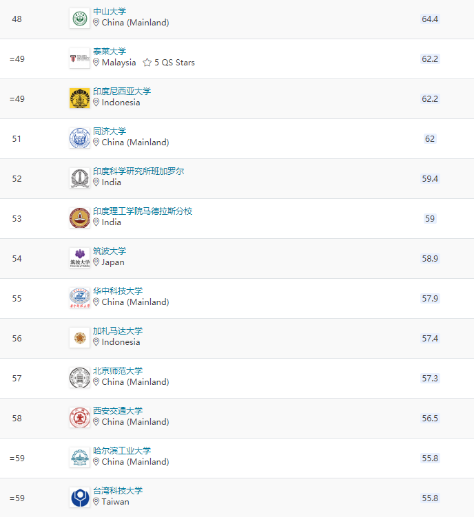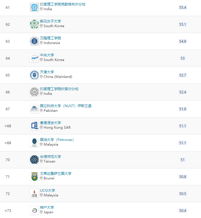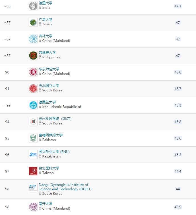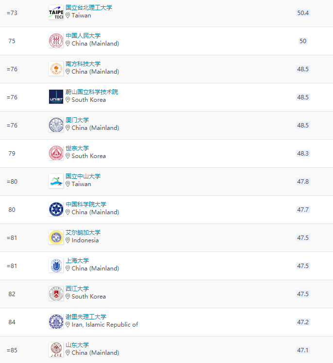 其他内地学校表现也非常不错,上升最多的是大连大学,上升了22位,来到了总榜单的132位。中国科学院排名上升也不错,上升了5位,来到了亚洲80位。