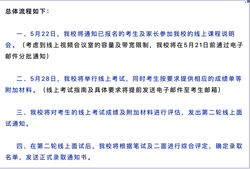 继5月4日线上考试结束之后,上实下一场线上考试时间也已经发布,已报名的考生和家长注意经常查看报名的电子邮箱,以免错过学校消息!