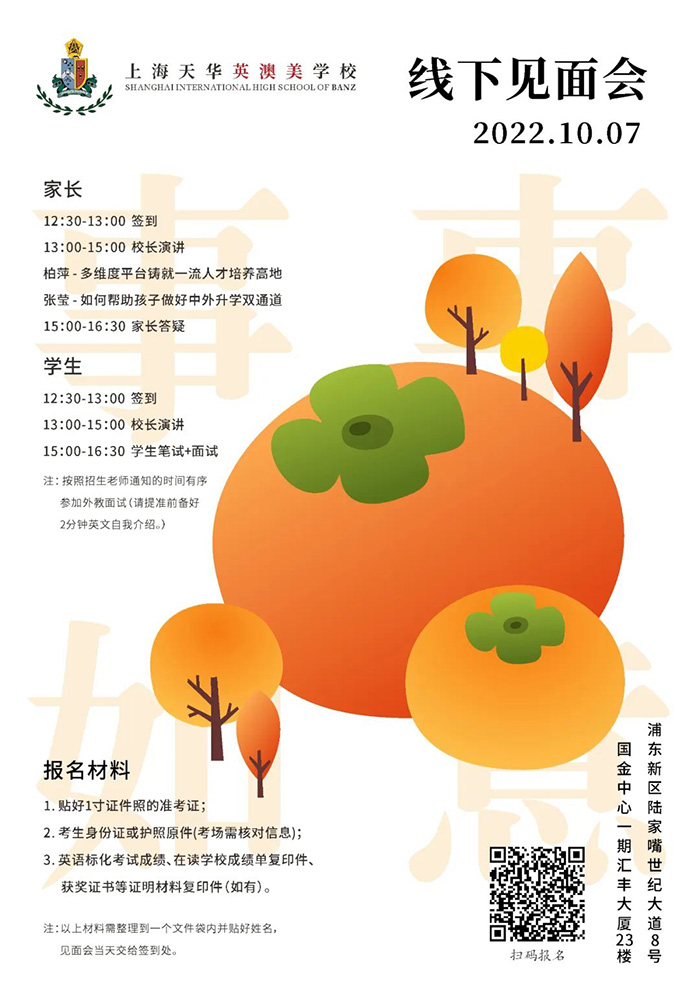 如果您对英澳美感兴趣,欢迎报名参加10月7日线下见面会,深入了解上海天华英澳美学校。