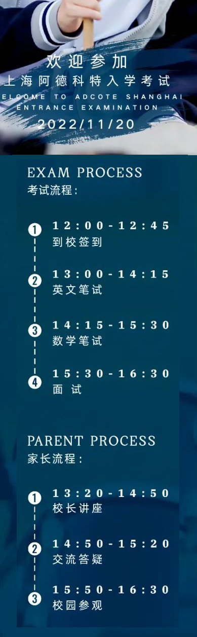 上海阿德科特学校“2023年春季入学考试(第二场)”将于11月20日在线下进行,欢迎各位考生积极报考。如届时受疫情等因素影响无法线下开展,我校会及时做出调整并第一时间告知各位考生及家长。